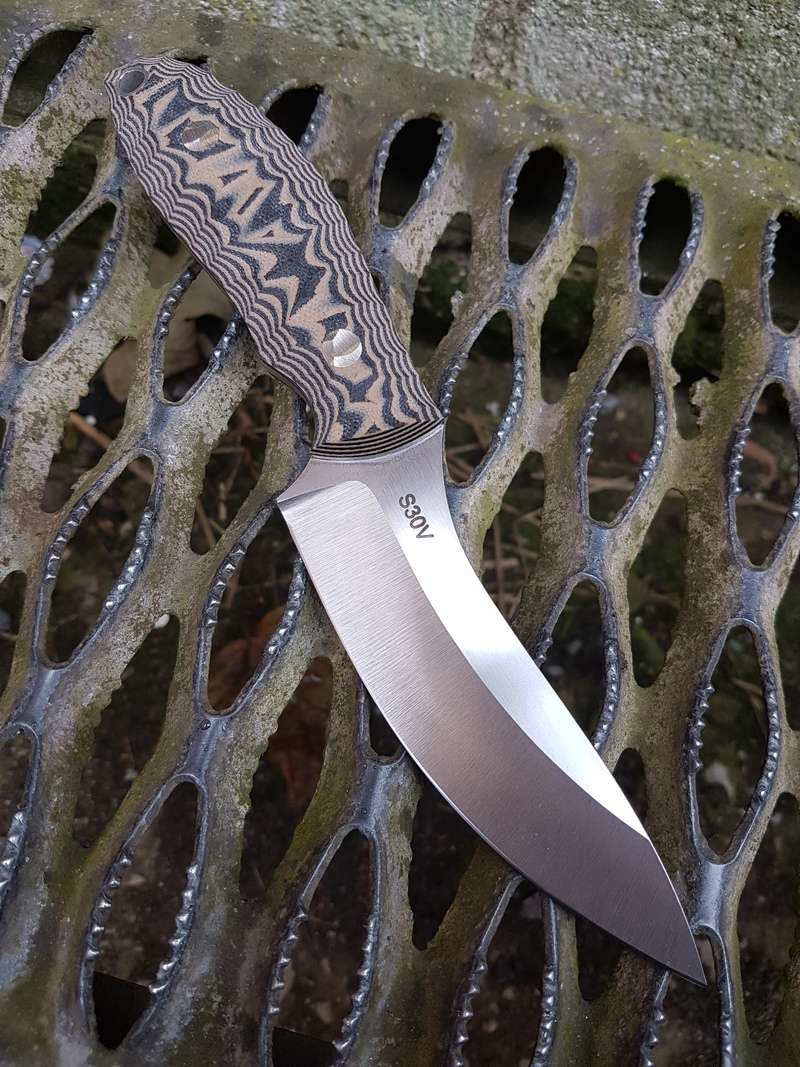 Price £320 - SOLD S30V Evo Stainthorp Knives Modified Evo model in CPM S30V and black/tan G10 Model: Evo Blade Length: 5" Overall Length: 9" Thickness: 5mm Steel: CPM S30V Handle: Black/Tan G10 Features: Stainless fixings, tapered tang, kydex sheath